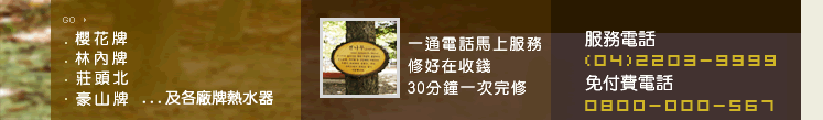 台中熱水器維修修理、台中熱水器安裝、台中櫻花牌熱水器維修、台中林內牌熱水器維修、台中莊頭北熱水器維修、台中豪山牌熱水器修理,除了豪山、林內、櫻花熱水器修理,外亦修理各廠牌,瓦斯熱水器、電熱水器、瓦斯爐、。